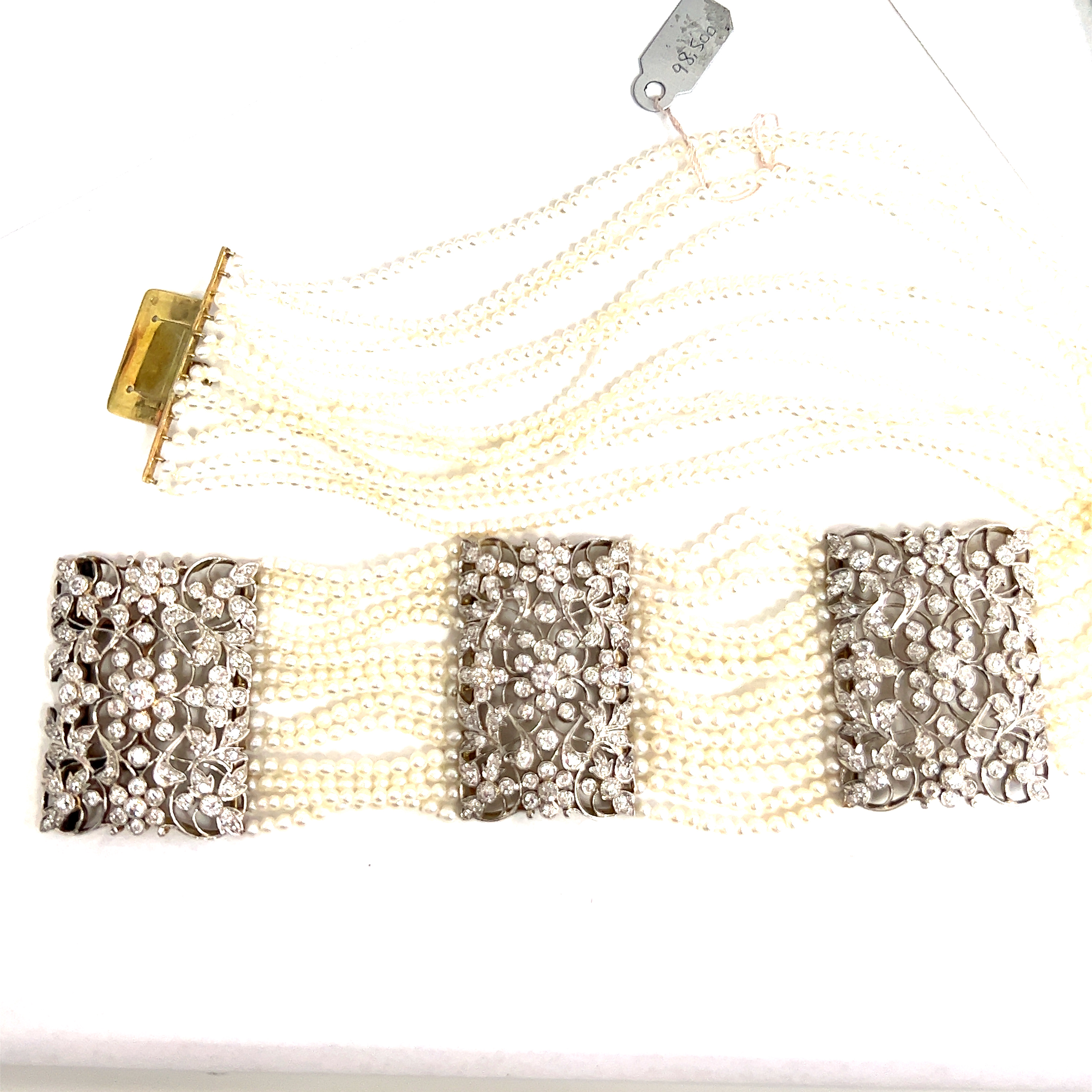 Description : 18k Gold on Silver Art Nouveau Pearl Diamond Necklace